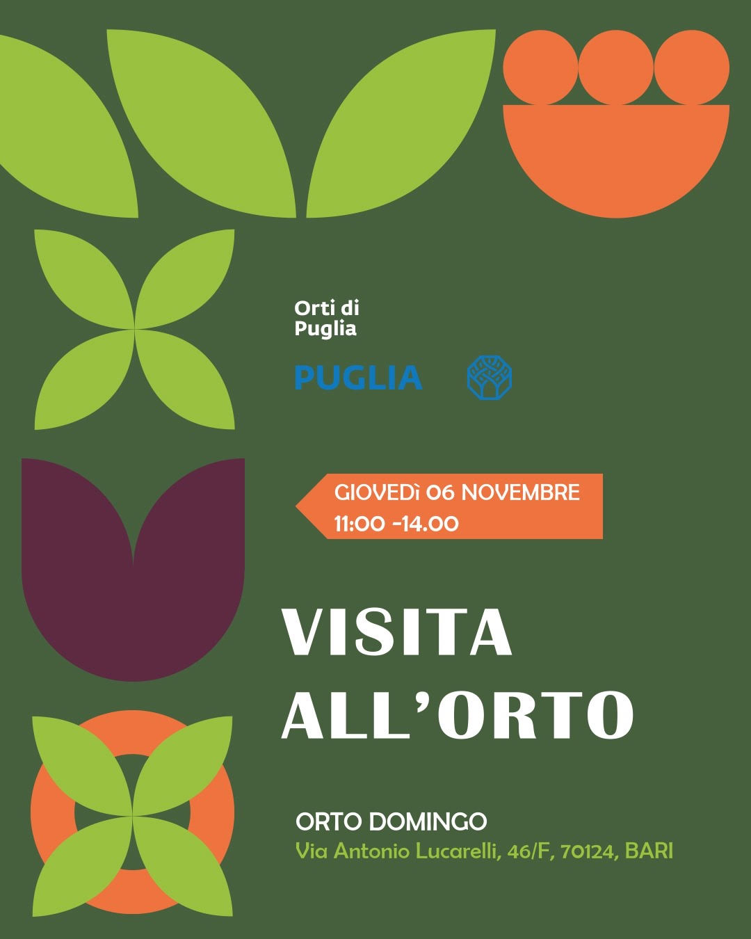 L’evento si terrà il 6 novembre 2025, dalle ore 11:00 alle ore 14:00, presso Orto Domingo – Via Antonio Lucarelli, 46/F, 70124 Bari (BA).