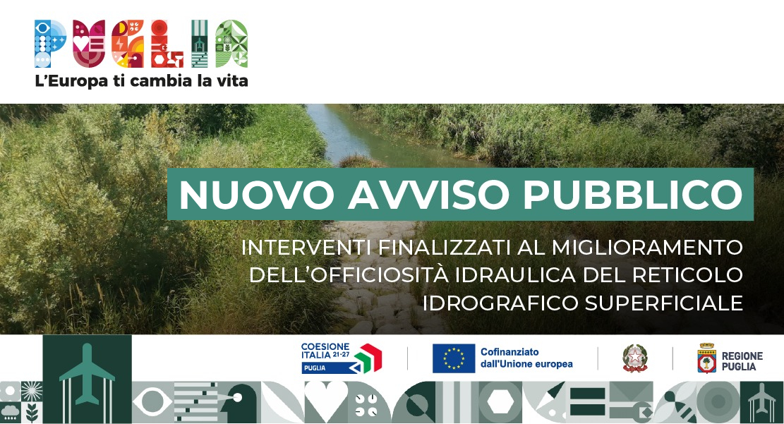 Con Determinazione del dirigente sezione difesa del suolo e rischio sismico 26 giugno 2025, n. 72 pubblicata sul Bollettino Ufficiale della Regione Puglia n. 55 del 10.07.2025, è stato approvato il Nuovo Avviso pubblico PR Puglia FESR-FSE+ 2021-2027 - Asse Prioritario II “Economia verde” - Azione 2.5 “Interventi per la prevenzione dei rischi e l’adattamento climatico” - sub-Azione 2.5.3 “Miglioramento dell’officiosità idraulica del reticolo idrografico superficiale”. Approvazione Nuovo Avviso pubblico per la selezione di interventi finalizzati al miglioramento della officiosità idraulica del reticolo idrografico superficiale.