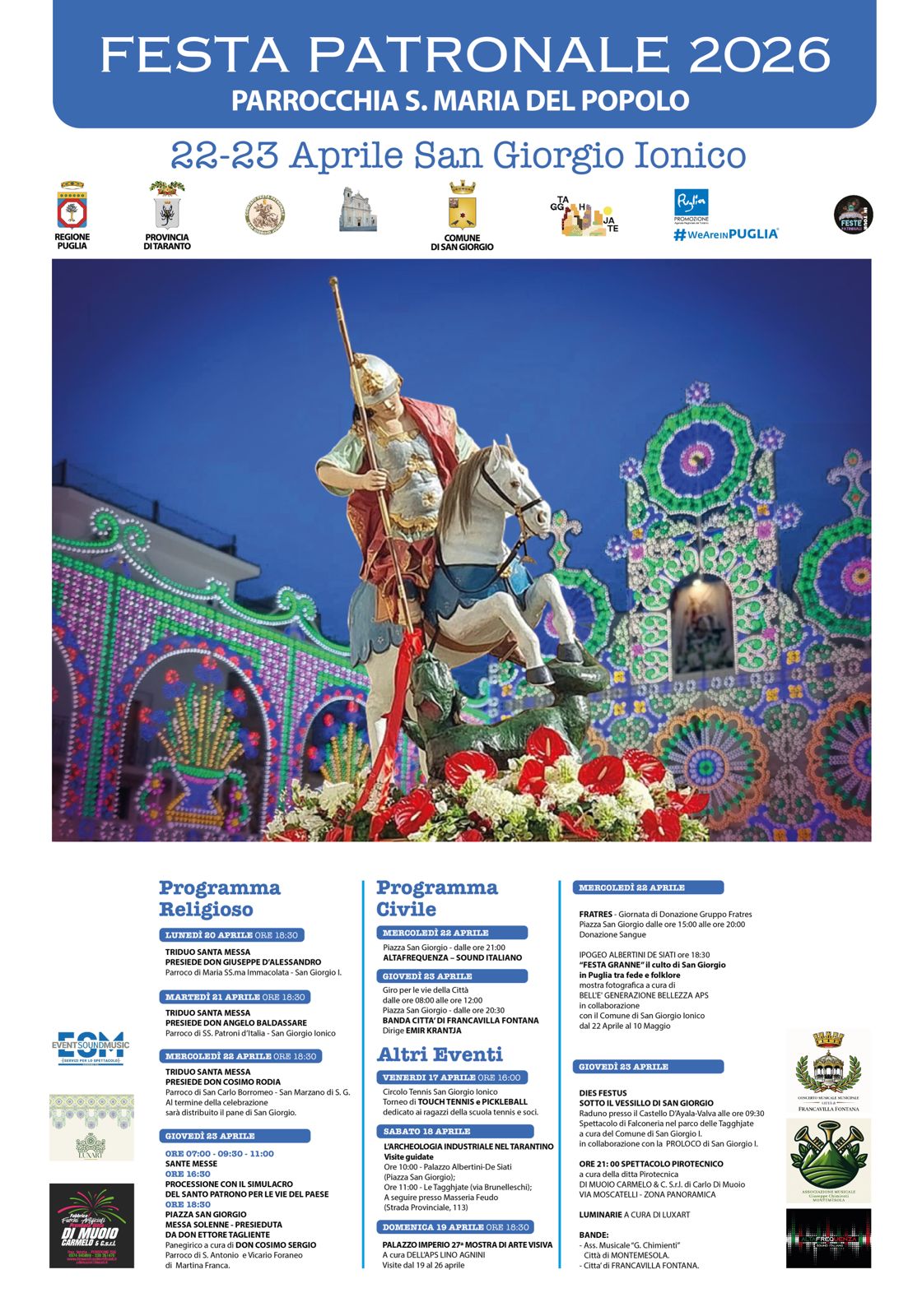 L'appuntamento si avvale del patrocinio della Regione Puglia. La festa di San Giorgio Martire si conferma così non solo come espressione di profonda devozione religiosa, ma anche come importante occasione di promozione turistica e culturale della Puglia, capace di raccontare, attraverso tradizioni vive e partecipate, l’identità autentica del territorio.