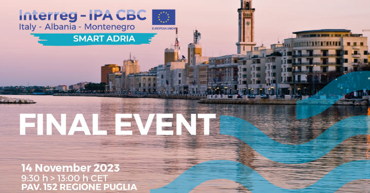 Non perdere l'evento finale del progetto Smart Adria Blue Growth che si terrà il 14 novembre 2023, dalle 9.30 alle 13.00, nella Sala 1 del padiglione n. 152/Regione Puglia, in Fiera del Levante a Bari.