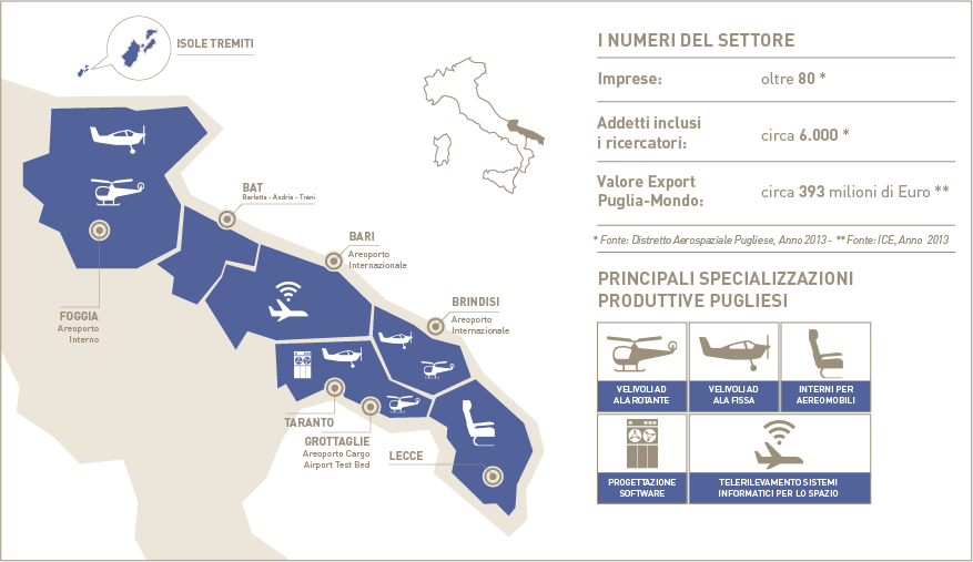 Unico caso italiano, la Puglia non solo accoglie tutta la filiera produttiva, dalla componentistica alla creazione dei software, ma vede la presenza di aziende con diverse linee di progettazione e produzione: ala fissa, ala rotante, propulsione e software aerospaziali, tecnologie all’avanguardia nell’utilizzo di materiali compositi in fibra di carbonio per i quali la Puglia è un’eccellenza mondiale.