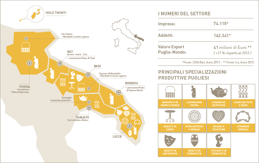 La Puglia, un concentrato di storia, culture e bellezze paesaggistiche, custodisce nel territorio tanti materiali che nelle mani dell’uomo si trasformano in oggetti di uso domestico e in vere e proprie opere d’arte. Una tradizione secolare che racchiude in sé tutta la storia della regione e che ancora oggi vive tra le strade e i vicoli dei centri storici. Importante risorsa economica, l’artigianato si è rafforzato nel tempo coniugando la tutela degli antichi mestieri con l’innovazione e l’internazionalizzazione.