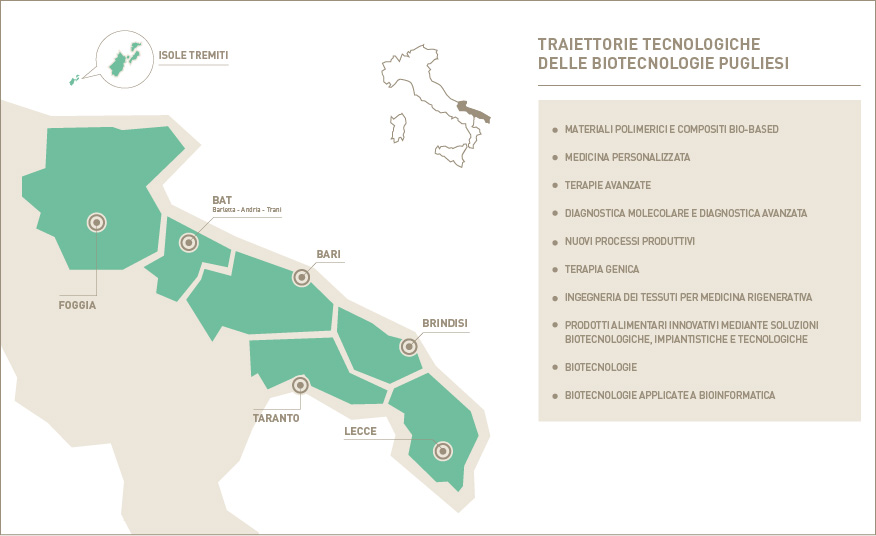 In Puglia le biotecnologie rappresentano una realtà in forte crescita caratterizzata da un emergente sistema imprenditoriale supportato da dinamico sistema di ricerca, che ha raggiunto livelli di eccellenza sia in termini qualitativi che quantitativi. Un fiorente sistema di università, centri di ricerca, laboratori e consorzi che con le imprese stanno contribuendo a portare sviluppo e ricchezza a tutto il territorio.