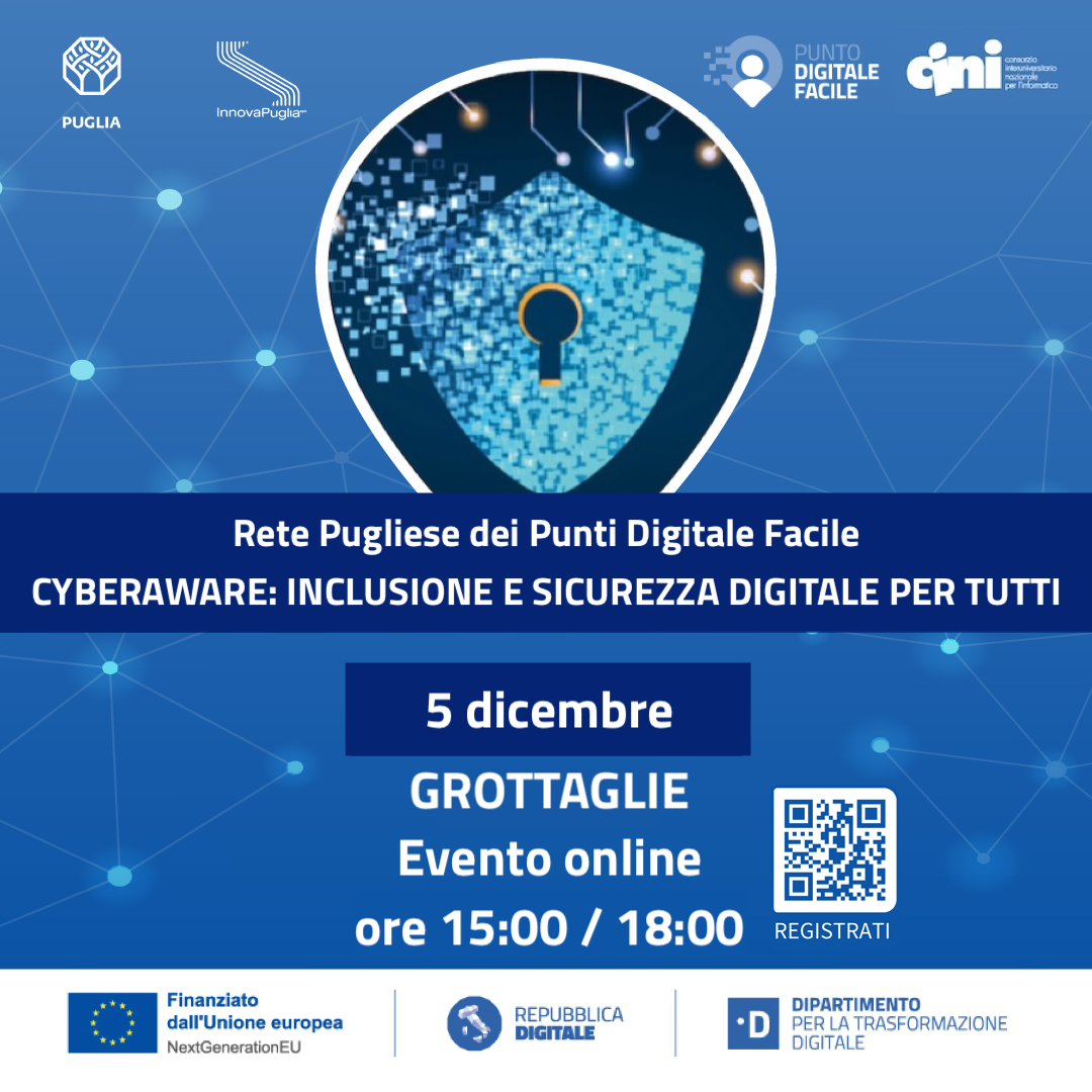 “CyberAware: Inclusione e Sicurezza Digitale per Tutti” è un'iniziativa prevista nell'ambito del progetto “Rete dei servizi di facilitazione digitale” promosso dal Dipartimento Sviluppo Economico della Regione Puglia con la collaborazione di InnovaPuglia SpA, finanziato con le risorse del PNRR - Investimento 1.7.2, nell’ambito del progetto nazionale del Dipartimento per la Trasformazione Digitale (DTD).