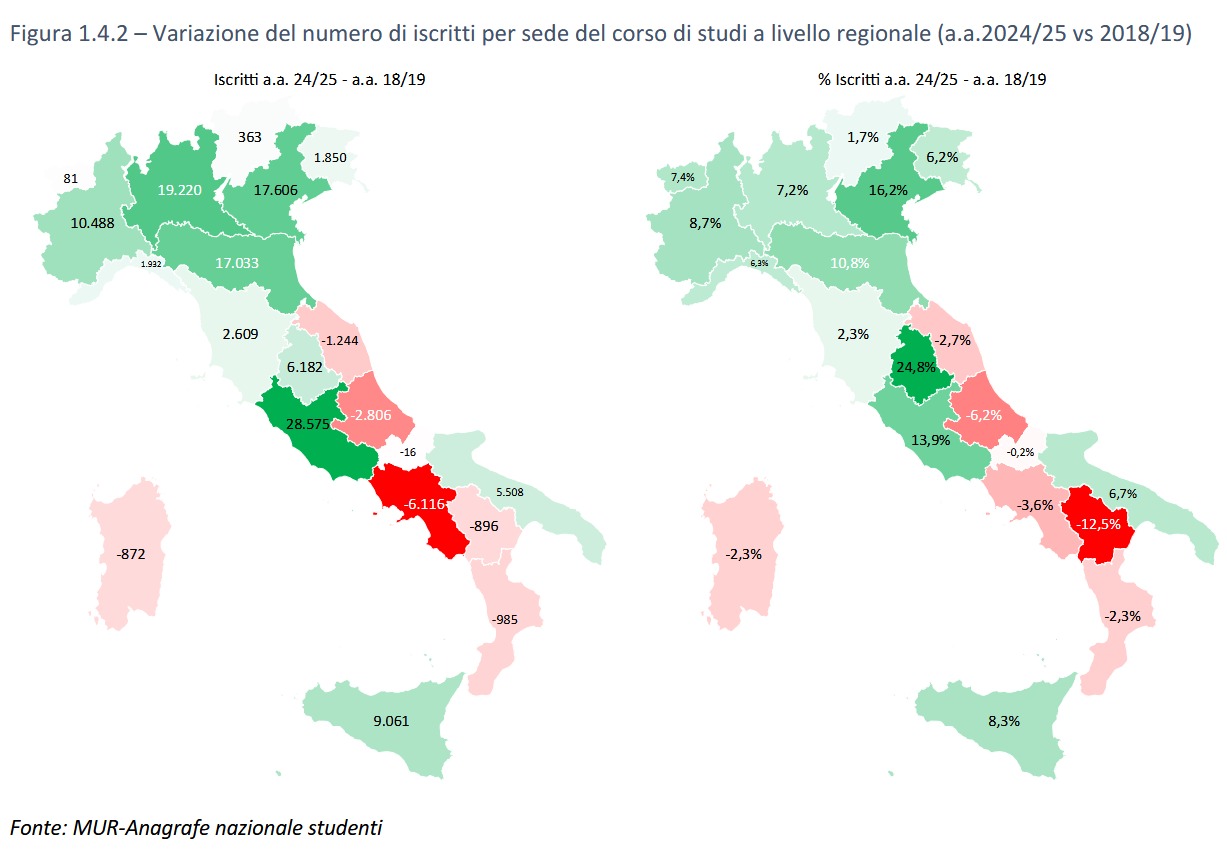 Sebbene il sistema universitario nazionale ha raggiunto il suo apice storico nel 2024/25, superando la soglia dei 2 milioni di iscritti, dal rapporto emergono notevoli diffenze territoriali: a fronte di un aumento generalizzato del numero di immatricolati (+296.000 di iscritti rispetto al 2018/19 al +16,9%) emerge la tendenza degli studenti a spostarsi verso le università del Centro e soprattutto del Nord. Mentre infatti al Nord l'80% delle università è in crescita e al Centro il trend positivo interessa due terzi degli istituti, nell Mezzogiorno invece quasi un ateneo su due (48%) subisce una flessione, trainata principalmente dal calo di attrattività dell'area economico-giuridica.
