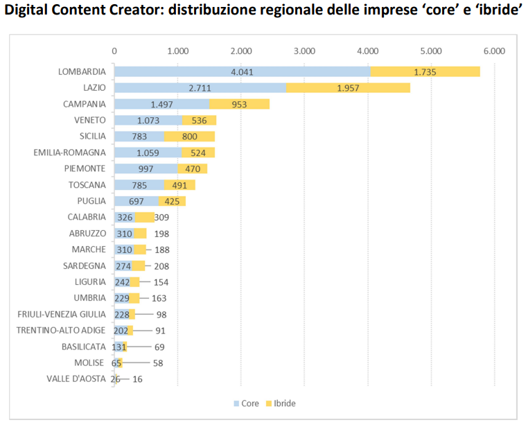 Il fenomeno mostra omogeneità a livello territoriale: "il Nord Ovest concentra infatti il 30,2% delle imprese (7.681), il Centro il 26,9% (6.834), il Mezzogiorno e le Isole il 27,9% (7.103) e il Nord Est il 15,0% (3.811). Milano conferma il suo ruolo di hub digitale nazionale con oltre 3.800 imprese, pari al 15% del totale, ma accanto ai poli tradizionali emergono nuove realtà come Puglia, Sicilia e Campania, dove il contenuto digitale è diventato strumento di promozione territoriale e di narrazione identitaria".