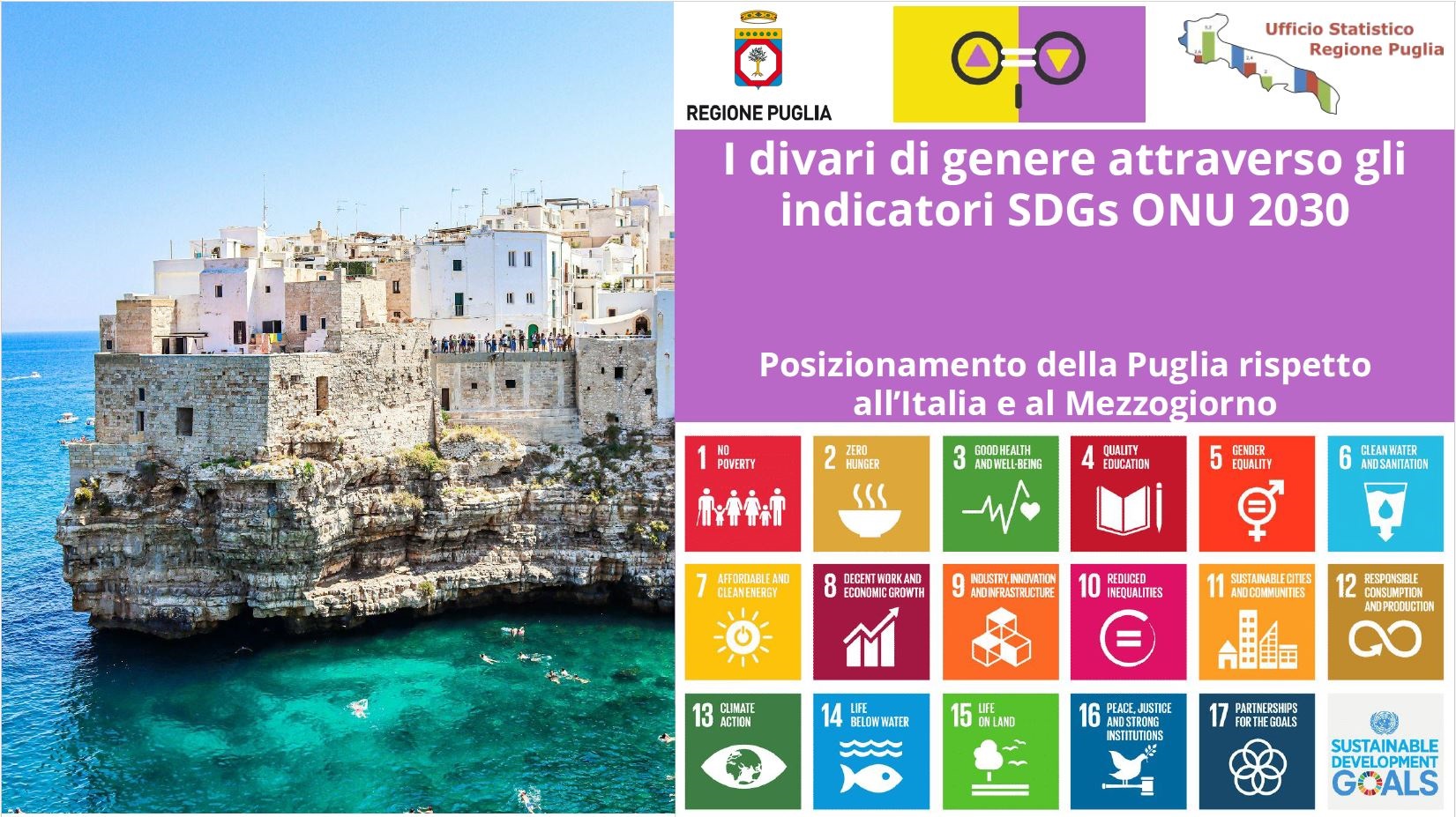 L'istat rende disponibili i dati per gli indicatori SDGs a livello territoriale e per genere aggiornandoli due volte all’anno. L'Ufficio Statistico della Regione Puglia si occupa della rappresentazione degli stessi, confrontando l'andamento della Puglia con l'Italia ed il Mezzogiorno negli anni.